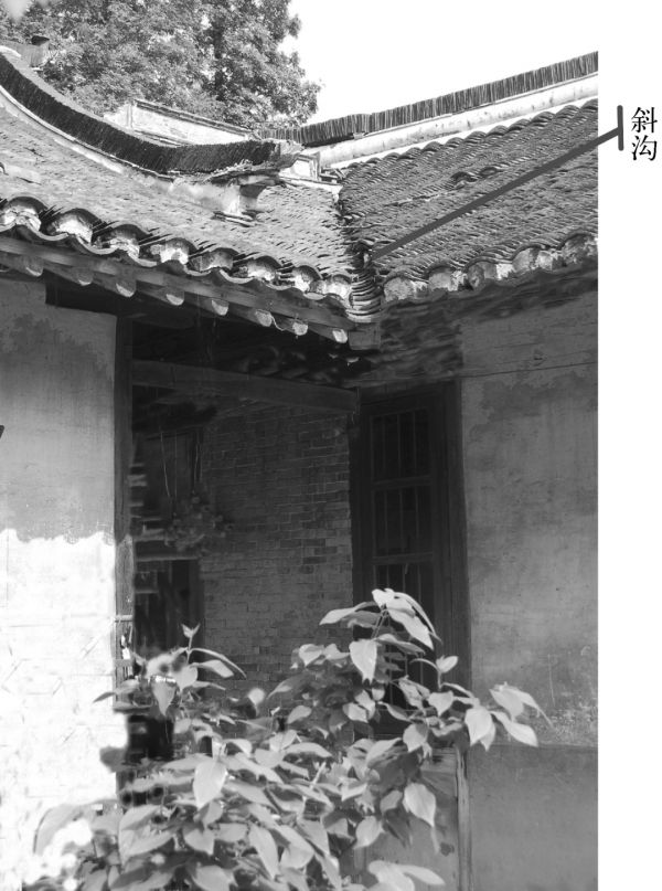 当东西向屋面与南北向屋面成45度相交时,相交之处便会出现斜沟。即绞圈房子正屋东西向屋面,与厢房南北向屋面,二者相连接时,屋面必须要安排好一条斜沟。称其斜沟,是因为沟的方向是斜向的,即或东南斜向西北、西南斜向东北,或东北斜向西南和西北斜向东南的。它是用瓦片铺成的斜状沟(图49),斜沟下方便是庭心(天井)。每幢绞圈房子,两进式的有4条斜沟,如是三进式的,前后庭心上方各有4条,一共有8条斜沟。斜沟底下从上到下,由弧形的斜沟瓦一张叠着一张铺垫组成,它比盖在屋面上的瓦片(称小瓦)体量要大得多。(图48)