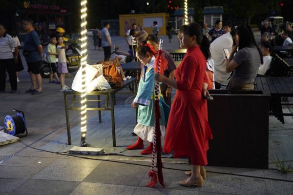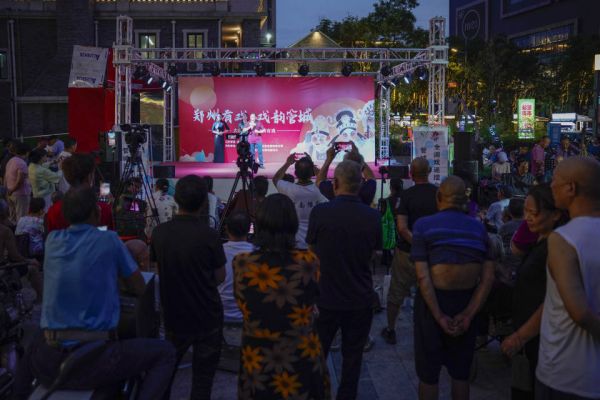 夏季的夜晚,这个广场是市民们休闲遛弯的好去处,此刻,它变成了一个充满欢声笑语的戏剧舞台。戏曲表演、名家选段、折子戏、豫剧红娘轮番登场,老中青少戏迷同台展演,诠释中国传统文化艺术的魅力。