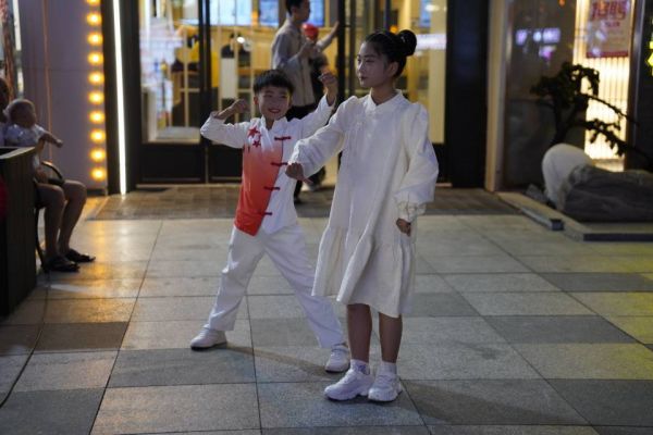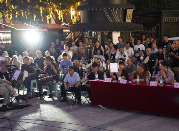 月光和灯光洒在广场上,形成斑驳的光影,空气中弥漫着热浪和汗水的味道,但这丝毫没有影响市民们的热情。他们或坐或站,或摇着扇子,眼睛紧紧盯着舞台上的表演。图为评委为演员现场打分。