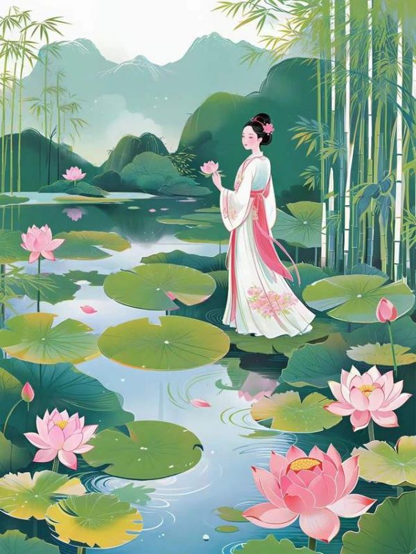 释义:清澈碧绿的湖面上,漂浮着荷花的香气;