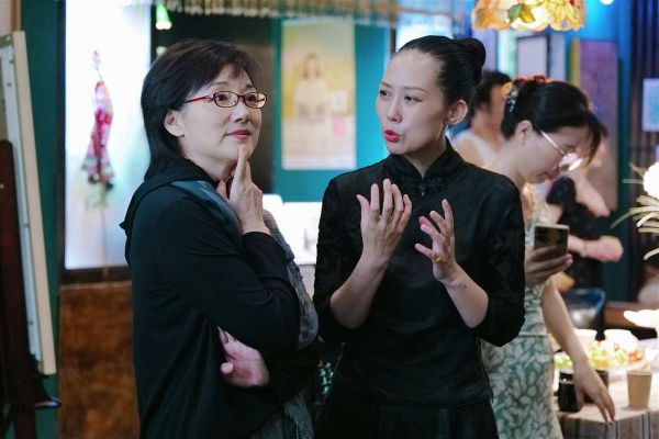 著名黄梅戏表演艺术家杨俊(左)观展,艺术家李蕾(右)分享自己的创作感悟