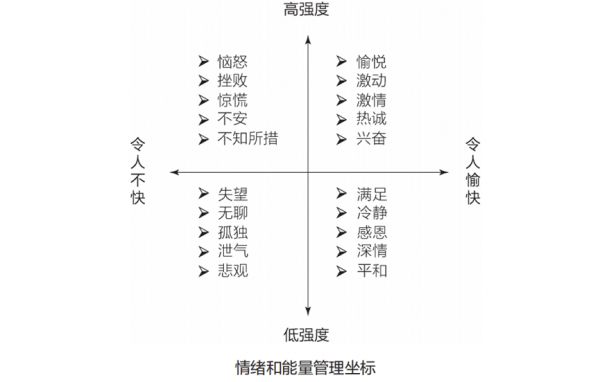 看看下面的情绪和能量管理坐标。回想你前一天的工作,你认为哪一项最能描述你一天的主要情绪?是恼怒、挫败,还是在平静满足的状态中度过这一天,很感激自己的工作?