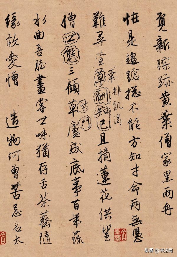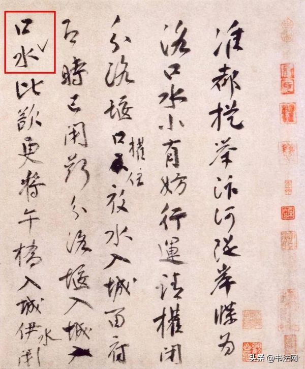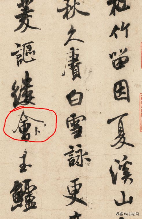 第三种方法是将正确的字缩小一号,写到错字旁,如沈周《跋富春山居图》、赵孟頫《跋怀素论书帖》等,这样处理既保证了卷面的整洁,又能一目了然,是很多书法家的首选。
