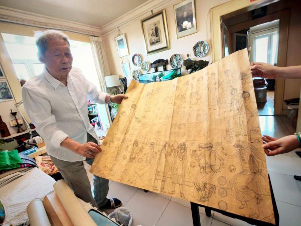 “当年的壁画原作,我们是一笔一笔画到墙上去的。”87岁的刘秉江至今保存着40多年前创作时的手稿。纸张虽已泛黄,但细腻的笔触清晰可见。“你看,这是景颇族,他们正在采摘的果实是可可。”