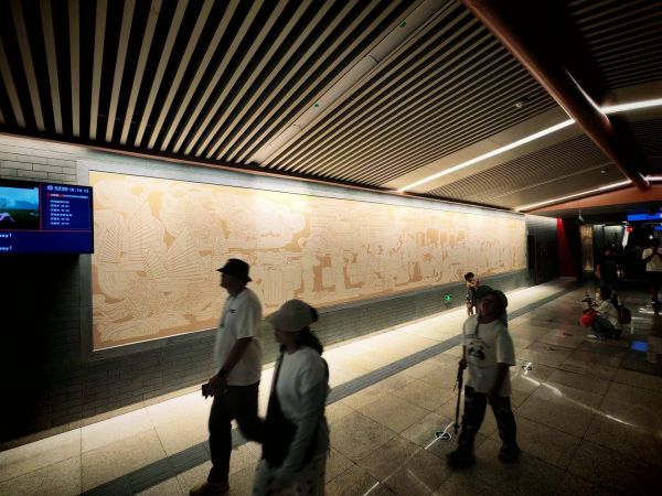 现在的北京,每年都有新地铁线通车。那些上新的地铁壁画,题材宽泛,材料和工艺更是五花八门。錾铜、彩色玻璃绘制、石材镶嵌、高温彩釉刻瓷、LED等都被运用到地铁壁画中。甚至地铁站在设计之初,就已经将装饰与壁画融入其中,从一开始就邀请艺术家介入。