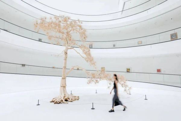 踏入展厅,高13米的纯白极简空间,中庭独占C位的装置《松》,延绵而上的螺旋式艺术步道,宛如置身于一幅巨大艺术长卷中,缓缓展开,引人入胜。观众沿着环形观展通道一路往上,仿佛行走在时光隧道中,而身边是张大千、关良、常玉、六角彩子、田中敦子等艺术家作品,向着展厅的天光云影,在一件件作品中感受百年以来世界范围内人类在视觉艺术领域中展现的非凡创造力。
