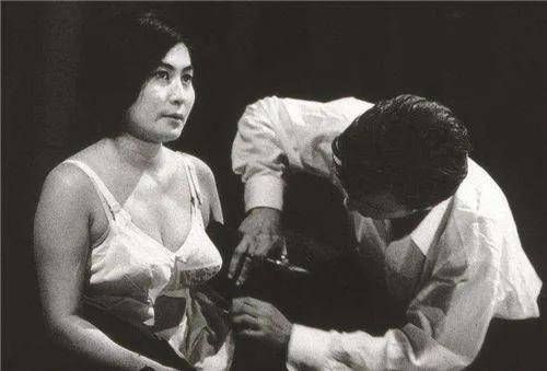 直到后来,有一位英国的男性观众走到了台上,他毫不客气的用手中的剪刀将小野洋子的外套剪开,随后又将小野洋子穿在外套里的白色背心全部剪下,临走的时候还将小野洋子内衣的两根肩带也剪断了。