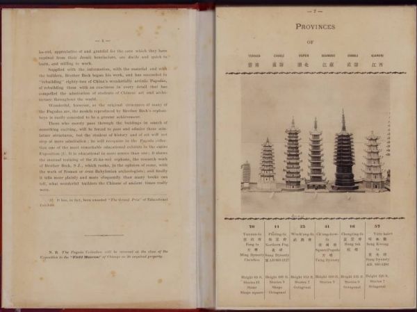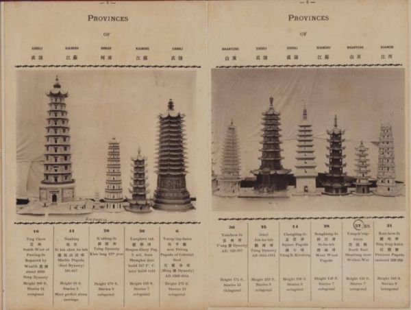 1912年,上海徐家汇的土山湾孤儿工艺院的300多位孤儿在木工部主任、德国传教士葛承亮(Aloysis Beck)的指导下,用了近三年时间制作了近百座宝塔、一个巨大的牌楼以及一大批艺术品,于1914年底运到美国旧金山参加1915年的巴拿马太平洋万国博览会。在博览会上,中国宝塔获得头等大奖。图册中有82座古塔,其中南京大报恩寺塔编号35号,上海龙华塔编号36号,均为等比例缩小仿真雕刻古塔。