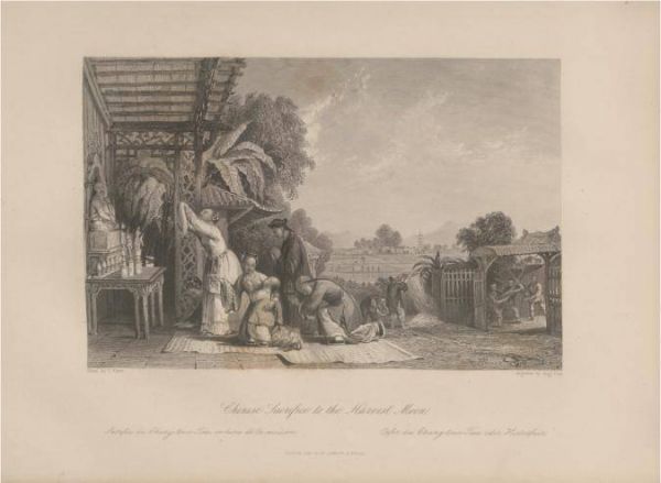 赖特点明图为扬州城外,主妇们正主持中秋祭祀,并在文中混淆了中秋与谷神祭祀。明清时中秋常供嫦娥、吴刚或兔儿爷,图中神像皆不相类。图中还同时出现了棕榈状植物与宝塔,皆为西方表达中国风情的经典意象。
