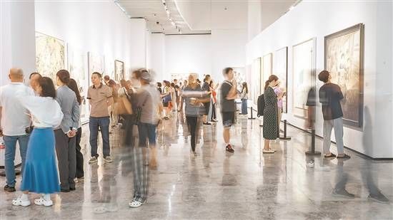 现场有不少观众告诉记者,他们通过媒体报道、社交平台等多个信息渠道早早得知全国美展展讯,并提早预约开放首日的进馆名额。市民卢阿姨告诉记者,上周就预约了开展首日前来观展:“刚逛了一圈感觉挺震撼的,有很多吸引人的作品。不管是写意画还是工笔画,都能看到一些材料、表现形式的创新,需要慢慢花时间欣赏。”