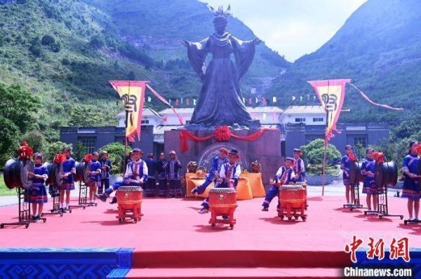 7月4日,祭祀布努瑶始祖密洛陀仪式在广西大化瑶族自治县七百弄国家地质公园博物馆广场举行。大化瑶族自治县布努瑶民众身着民族服饰,唱山歌,敲铜鼓,缅怀始祖密洛陀,欢度“祝著节”。当天进行了《壮瑶和鼓》《欢乐瑶乡》《瑶族敬酒歌》等节目表演。布努瑶是瑶族的一个分支。“祝著节”也称“达努节”或瑶年,是布努瑶纪念先祖密洛陀的传统节日,也是布努瑶一年一度最为隆重的节日。为庆祝“祝著节”,大化瑶族自治县民众放假3天。图为民族文化展演活动。杨志雄 摄