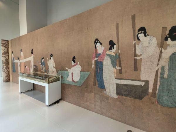 其中,来自波士顿美术馆中国馆藏的宋徽宗的《捣练图》尤为引人注目。《捣练图》娴熟地描绘了唐代贵族妇女在制作丝织品过程中的勤劳与柔美。这幅画以细腻的工笔重彩手法和不透明矿物颜色,精心描绘了唐代女子在捣练、编织、熨平、缝制等劳动操作时的情景,富有仪式感地展示了他们对丝绸业的奉献。现藏于波士顿美术博物馆的为宋徽宗临摹版本,原作者为唐代画家张萱。
