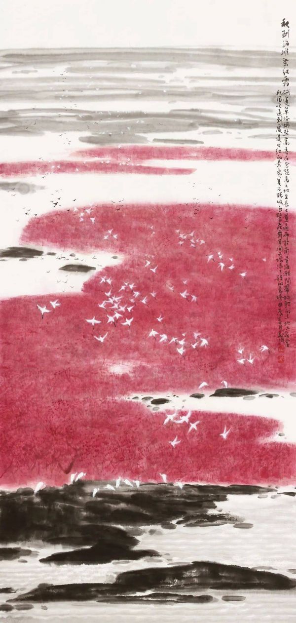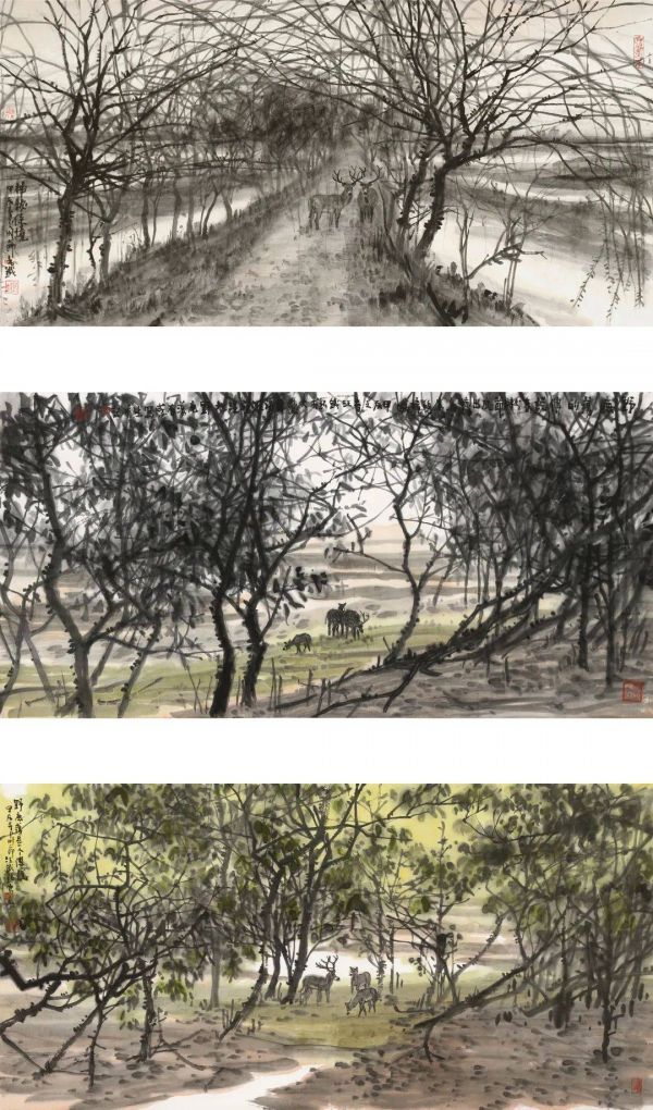 《天地晴暖》与《秋到海滩染红霜》则分别呈现了初夏与深秋湿地的壮丽景色。燕子回迁的场景生动活泼,泛红的碱蓬与白鹭、苍鹭的优雅身影构成了一幅幅生动的画面,不仅展现了画家们对色彩与构图的精准把握,更体现了他们对自然界的敏锐洞察力。汪铁铭的《野鹿荡写生系列一》则是一次对时间与空间的深度探索。通过细腻的笔触,他记录了海堤两侧防风林在四季更迭中的变化,洋槐树的每一枝每一叶都被赋予了生命,仿佛在诉说着岁月的故事。