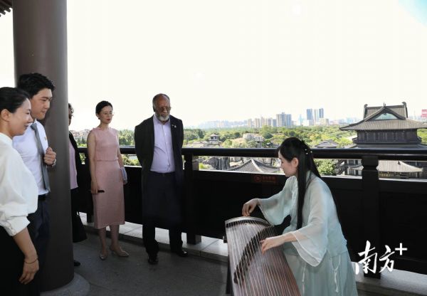 作为广州市文化馆内最高、最具标志性的建筑,中心阁高约39米,以汉唐风格打造,与曲艺园主楼形成南北走向的空间轴线。外宾一行从中心阁4楼廊道放眼望去,亭台楼阁高低错落,游廊花窗佳木翠秀,赏心悦目。其间,萨尔维总理还驻足聆听了古筝名曲《高山流水》。当了解到背后的寓言故事时,他点头表示赞许。