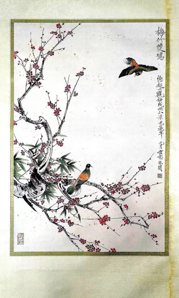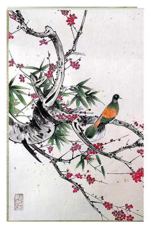 十分注重体察物理、物情、物态,以赵佶为中心研习花鸟画,非常重视两宋花鸟画的写生传统。他在《我怎样画工笔花鸟画》一书的第三章第三节专门以“我是怎样进行写生的”为题,他认为:“花鸟画无论是工细或是写意,最后的要求是要做到形神兼到,描写如生。”并指出:只有形似,哪怕是极其工致的如实描写,而对于花和鸟的精神,却未能表达出来,或是表达出来的不够充分,只能算是写生的“初步功夫”。在他看来,写生的最终目的就是“要为花鸟传神”。在这幅作品中,于非闇转换了思维方式,运用不同的图式法则,从而使作品呈现出新意。此作的构图并不复杂,绿竹红梅,并通过双鸠静动互映的姿态,生动表达出画面的主题和意境。在创作中,画家能够迁想妙得,对客体物象进行合理的概括提炼,将审美意象的气质风骨迁移到主观精神的情境中,从而生成艺术化的表现空间。在刻画物象的时候,不只是注重形与色,还突出内在的精神气质,无论画中的梅竹还是双鸠,皆在无限生机中体现着张弛有度、动静相谐的传统意韵之美。