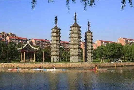 再往前走,我们来到了运河边的嘉兴三塔。三塔初建于唐代。据《嘉禾志》记载:此处有白龙潭,水深流急,行舟过此多沉溺,人们推测“潭中有白龙兴风作浪,于是运土填潭,建三塔以镇之。”唐季僧行云,运土填潭,建塔三座以“镇潭中白龙”。据介绍,三塔均为九层砖塔,中间一座稍高,约15米,塔内无梯可攀,每层壁嵌铁制浮雕佛像,饰白、黑、红三色。历史上三塔是一座富有传统建筑风格的砖塔,造型美观,观之赏心悦目,足以说明古代劳动人民在建筑科学和艺术上的聪明智慧。现存的塔是2000年重建,工艺并不太精美,但三座塔沿着运河边一字排开,远处看还是不错的。我们因行程较紧,又遇到暴雨,因此并没有多加停留。