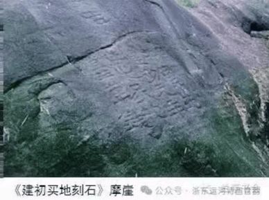 位于越城区富盛镇乌石村跳山东坡上的“大吉碑”-《建初买地刻石》,是浙江境内发现认定年代最早的摩崖题刻,距今已有1900多年,是我国现存时代最早、文字面积最大的地券刻石。发现此刻石,还有一个故事:清道光年间,一位叫杜春生的绍兴人来寻找先辈的坟地,偶然在这块山地上歇息,发现了东汉题记。当时,这块刻石“色黝然而黑”,当地人告诉他石上有字,被苔藓遮住,他“剔除苔藓,谛视乃东汉题记”,于是他“以万钱购得之”。当年冬天,杜春生带上新拓本,拜见了时任湖广总督、他中举时的考官、鉴帖名家吴荣光。吴荣光一见拓本,惊叹不已,认为这是“真汉人文字,遂为越中第一最古之石,历代著录所未收”。并认定“大江以南,汉刻其时代无有先于此者”。吴荣光手书题记:“后一千七百四十八年,道光癸未,南海吴荣光偕仁和赵魏、武进陆耀遹、山阴杜煦、杜春生,获石同观”。此刻今在大吉碑右侧,“汉建初摩崖大吉石刻”录入《两浙金石志》增编补遗篇中。