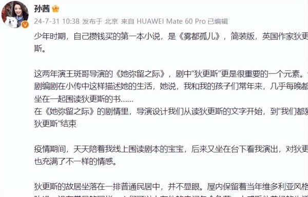 2024年7月31号上午10:38,知名女演员孙茜在其个人社交平台发文称: