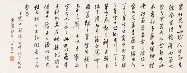 其中,《墨花飞舞》手卷分为花卉国画和书法题跋两个部分,是其中最为精彩的作品。但见长卷徐徐展开,九种花草错错落落、起起伏伏,然又有一股清气贯通其中,充分体现了宾老在笔墨上的深厚功力。纯水墨更考验画家笔法和墨法的功夫,更需控制好墨且用好水而使墨色变化丰富而有度,黑白形成的各类不同形制的空白和浓淡枯湿的线条诠释了不同花卉偃仰起伏之形态、生长结构之特征和枝叶穿插遮挡之空间布局。“宾虹先生山水,人皆知其综合古法,镕铸而成大家。其实花卉亦然。即如此卷,看似青藤、白阳,细细体会拙处、厚处,实与徐、陈二家不同。盖青藤、白阳用行草之笔写出,宾老用篆隶之笔写生故也。用行草之笔写飞动之神,其弊易流于滑,而青藤、白阳无之;用篆隶之笔写古朴之气,其弊易流于蛮,而宾老亦无之,此所以各有千秋也。要在能炼就腕力,使用中锋,方可臻此境界。特为指出,不知阅者以为然否?壬寅中秋,张宗祥记于杭州寓庐,时年八十有一。”这段长卷题跋的文字是六十年前西泠印社社长张宗祥写在黄宾虹花卉《墨花飞舞》手卷上的,虽只区区百余字,却与花卉内容相得益彰,珠联璧合,也是对宾老花卉创作的笔墨奥秘的高度总结和评价。此篇似为张宗祥先生为宾老此卷花卉后补的书法题跋,因卷首写有“宾虹先生花卉遗卷”字样,此仅为余之愚见。