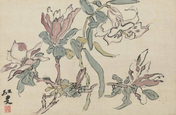 近日,笔者十分有幸在西泠印社观其社藏黄宾虹先生山水、花鸟及书法作品17件,其中花鸟作品以花卉册页为主,此外还有《设色玉兰百合》、《老梅》、《墨花飞舞》手卷、《设色玉簪》,还有与潘天寿先生合作成扇一把,总体数量虽不多,但在其中可以窥见宾老花鸟画创作之一斑。