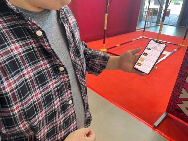 你见过拿着手机,逐个扫描二维码细细观赏的观众吗?中午12:30,就有这样两位观众。