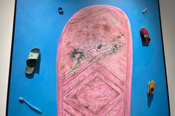 展览中,3号作品《我留在这个世界上的痕迹3》以巨大的粉色鞋底为核心,并拼贴着艺术家在水患灾区收集的旧牙刷、瓶盖、药瓶等现成品,无言地展现了自然灾害对人们生活的沉重打击,让观众深切体会到人类在灾害面前的无力与孤独,从而唤起对受灾群众的关怀与同情。