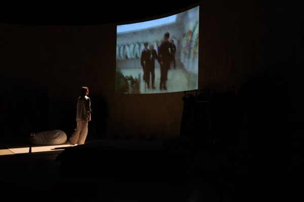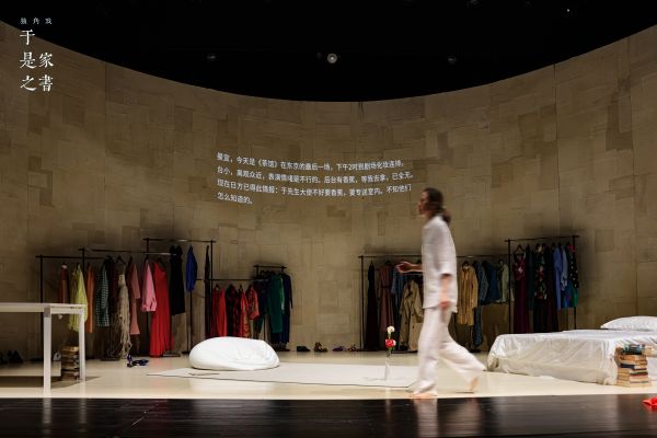 独角戏《于是之家书》首演当天,弧形白色舞台上挂满了各种戏服,舞台上方的大屏幕,则在进场时无声放映着有关于是之的纪录片。在开场前的45分钟里,剧场里循环播放着由不同声音朗读的一封封于是之和李曼宜的书信,朗读者中,有杨立新、吴刚、岳秀清、卢芳、苗驰、雷佳、邹健、原雨等众多北京人艺演员,他们每个人都愿意以这样的方式,表达对前辈的怀念和敬意。