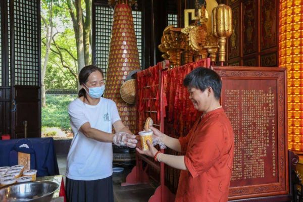农历七月十四早晨7时许,上海方塔园天妃宫前人头攒动,游客有序排队,依次领取豆浆、油条。民间传说这一天是被尊为松江府城隍的英雄李待问的生日,人们以喝豆浆、吃油条来纪念他英勇守城的故事。