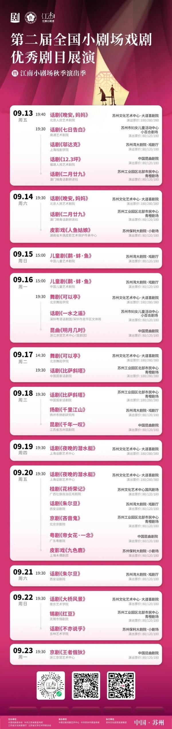 三大院团,三部话剧,彰显了小剧场戏剧“小而美,美而精,精而深”的独特魅力,同时也将苏州贯彻落实文化强市“811”计划、把更高质量的文化消费产品送到群众身边的意图显露无遗。不只是三大话剧院团,9月的苏州,五湖四海的院团“轧闹猛”,好戏连台11天,囊括了“百味人间”“京腔昆韵”“城市记忆”“国潮新声”“幻影人生”“童心逐梦”6个主题,既有话剧、舞剧、儿童剧,又有昆曲、京剧、扬剧、粤剧、桂剧、锡剧、皮影戏。