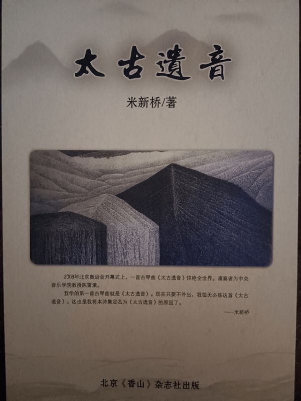 《太古遗音》是米新桥最新出版的一部诗集,是继《正始之音》《话外之音》出版之后,又一曲抒发诗人家国情怀、心声泪痕的诗和远方!