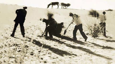 烈日炎炎,六个老汉背着成捆子的树苗艰难行走。一棵接一棵树苗被栽进沙漠,连成一片小丛林。