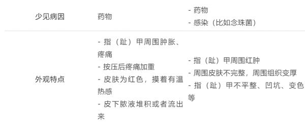 甲真菌病:真菌引起的灰指甲(也就是甲真菌病的俗称)除了有指甲盖的破坏外,偶然会影响到周围皮肤,表现为红肿,偶尔会有化脓和渗水,这个过程是慢性的。