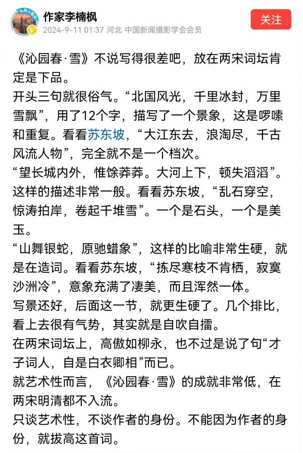 回到最近的事情上来!文学作品,大家都可以评论,这是每个人的自由。但,评论要客观,不能通过歪曲方式去博人眼球。我看了李楠枫最近关于《沁园春·雪》的评论,更加坚定了我对这个人的看法——喜欢哗众取宠。