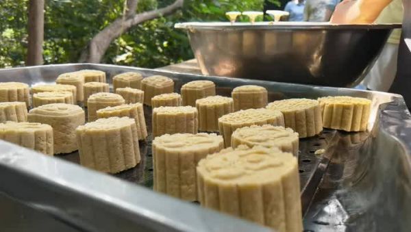 中秋节,月饼是当仁不让的主角。茱萸湾风景区的工作人员早早忙活了起来,为国宝大熊猫以及其他动物们精心制作月饼。饲养员蒋峰介绍:“这个里面最主要有玉米、黄豆,还有米粉,这个比例大概在2比2比1,然后再加上一些微量元素、食用盐,还有一些鸡蛋,保证每天营养的充足。”