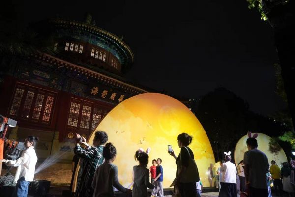 当日,北京大钟寺古钟博物馆举办中秋主题活动,邀请游客做月饼,染漆扇,赏古钟。