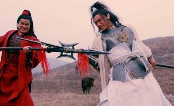 这二人,一个通身红色,一个全身白色,都用方天画戟,他们就是小温候吕方和赛仁贵郭盛。两人斗到深处,戟上面的绒绦结住了,绞在一起,挣脱不得,得亏花荣一箭射开。
