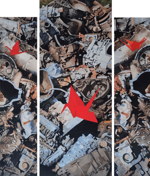 “老旧的机器零件它是一个时代,也是我国工业发展的一个见证,现在它们已经退出历史舞台了。但是我用这个红色的纸鹤形象做了一个串联,这是对新时代,对新工业的一个畅想”邵力勇介绍作品《时代的畅想》时说道。邵力勇的此次展览从9月24日持续到10月7日,贯穿整个国庆假期,其选择参展的这部分作品与国庆主题不知不觉有着一种默契。“这些在中国的工业发展进程里都做出过贡献,现在我们国家更加繁荣富强,创作这些作品也是希望大家不要忘记记旧时的路,更好地走走向未来。”