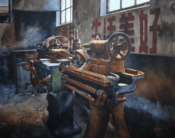 旧日时光的创作主题一部分是工厂、机械。“我是在工厂长大的。我创作的很多作品都是我小时候见过的。随着工业的发展,慢慢地这些机器已经退出了。”邵力勇说。