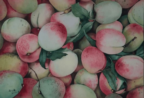 “这幅作品呈现的都是小时候我父母的一些信件和文件,还有小时候我们全家的合影,我尽自己的能力把他们都画下来。”邵力勇介绍《心灵的珍藏》是此次参展作品中最满意的作品,“包括后面一些主题为桃子的作品,我其实画了一个系列。他们都是父母喜欢吃的东西,因为父母已经不在了,所以我就把它画下来。”