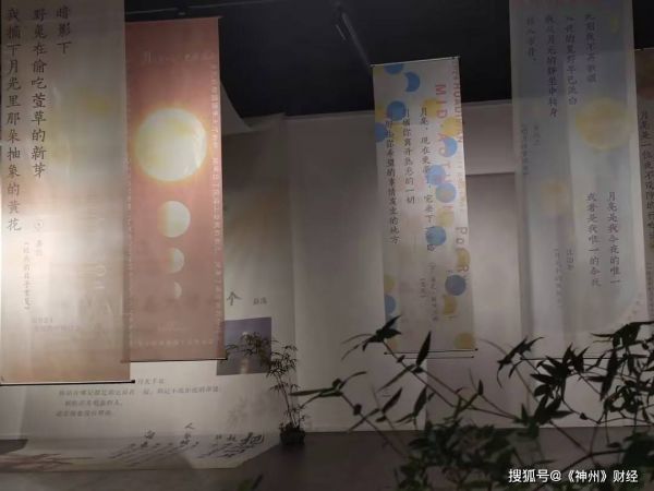 此次诗会,形式多样,还有诗歌展。除了在花地湾古玩城二楼的空间展出诗歌装置之外,还展出了画家孙诗梅与孙诗雪两姐妹创作的月亮题材画作。诗梅以诗人黄礼孩的“如果此世的尘灰让蓝色暗淡下来/就把理想的明灯点到月亮的骨骼里去/向破碎的生活致意”作为画意,画出了清新的意境,而诗雪以诗人洛尔迦的《小小的死亡之歌》为构思,营造了月亮之死的意象,画面迷离,充满了怜悯之心。