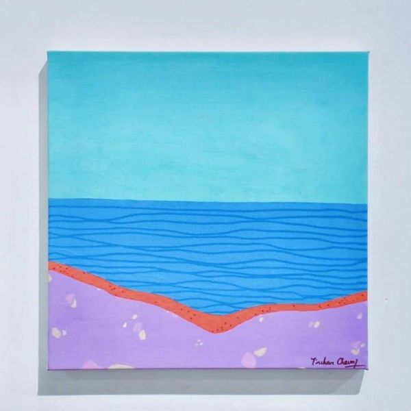 《Summer seaside》描绘的是大海与沙滩,张天尘大胆地将传统印象中金黄的沙滩着色为粉紫色,这一颠覆性的色彩选择瞬间打破了常规,营造出一种梦幻般的氛围。粉紫色,这个常被视为甜美、浪漫与梦幻的色彩,在张天尘的笔下被赋予了新的生命力,它不仅是对自然美景的艺术加工,更是艺术家内心舒畅与自由状态的直接表达。整幅画面洋溢着轻松愉快的气息,仿佛能够瞬间将观者带入一个无忧无虑的假日时光,让心灵得到彻底的放松。
