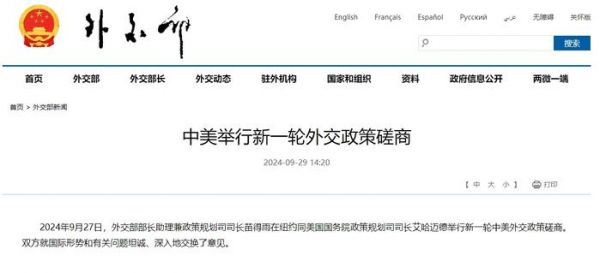 新京报讯 据外交部网站消息,2024年9月27日,外交部部长助理兼政策规划司司长苗得雨在纽约同美国国务院政策规划司司长艾哈迈德举行新一轮中美外交政策磋商。双方就国际形势和有关问题坦诚、深入地交换了意见。