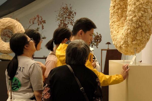 名为“一对”的作品在展区吸引不少人驻足——竹制装置采用两个半圆组合成一个完整的圆形,红绿白相间的鲜花植物穿插其中。“我想诠释‘另一半’的象征意义,并且从东方风格的叙事方式表达。”学员王桂芬向小锦介绍,竹子的自然纹理与曲线能勾勒出和谐的对称美,能体现东方文化中对完整性和平衡的追求,双半圆的结构不仅表现统一和谐,也寓意互补与永恒的联系,展现独特生命力。