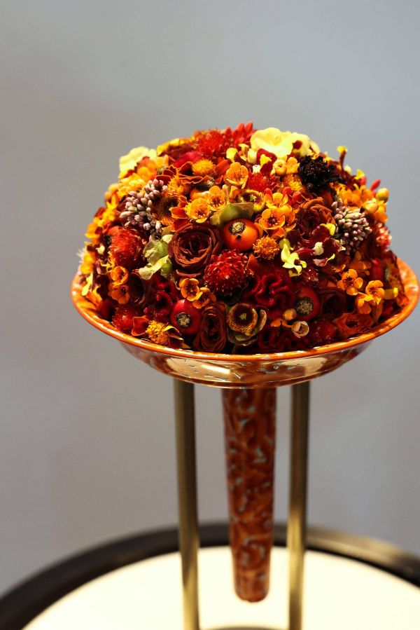 那么,何为架构花艺?“这是超越花艺的综合艺术表现,让鲜花完成它本身达不到的设计,让设计者与花艺互相成就。”景千晨表示,学院注重培养学员的探索力,因为重要的并不是技术,创意和设计思维才是主导,哪怕是废旧材料,打败平庸才是设计,“展出的作品看上去可能有的简单、有的复杂,但都需要学员5-7年的训练时间才能完成。”