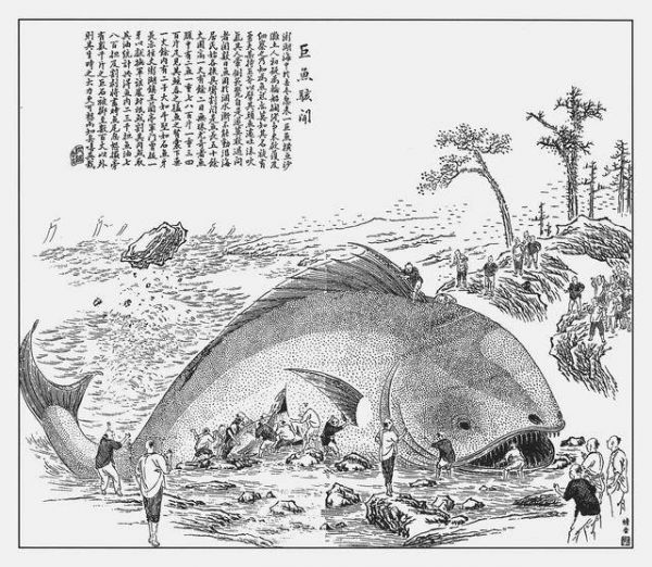 当然,也有些异物暴露在光天化日之下,可惊可愕。或是搁浅的鲸,或是被人猎获的鳄,画师将其置身于市井红尘之中。通常是某某处发现怪异的动物,乡人不识,以为是妖怪,消息不胫而走,图像在这里充当着传播的媒介。在处理这类事件时,《点石斋画报》的画师们往往引经据典,考证某动物的来历,希望从经史之中得到答案,而最后往往一无所获,只好说“质诸博物君子”。