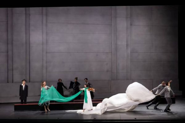回到《战争与和平》,在舞台上,我们没有看到通常的导演处理里会看到的奢华的舞会和残酷的战争场面,一切的宏大叙事都被悄无声息地藏了起来,图米纳斯的导演语汇是空灵且肃穆的。在通常可以想到的导演处理里,贵族奢靡的生活和战争血淋淋的残酷会形成鲜明的对比,这样的对比很容易形成强烈的视觉冲击。然而图米纳斯放弃了这种容易想象的手法,他带来的舞台是空旷、素净的,灰、白、黑的颜色,没有多余的装饰,只有一面高大的灰色墙壁。墙壁会推进、会旋转、能够参与表演,让观众的注意力集中在角色的内心世界和情感表达上,同时也为剧情赋予了更多的象征意义。墙壁有时成为压迫角色的巨大力量,有时又像一堵无形的心墙,隔离了角色之间的情感交流。舞台的空给予了音乐和表演有充分的空间去呼吸,去充盈整个剧场,去传递导演的风格和思考。这种象征性的舞台设计,让观众在简约的视觉呈现中,感受到一种“无画处皆成妙境”的东方意境。