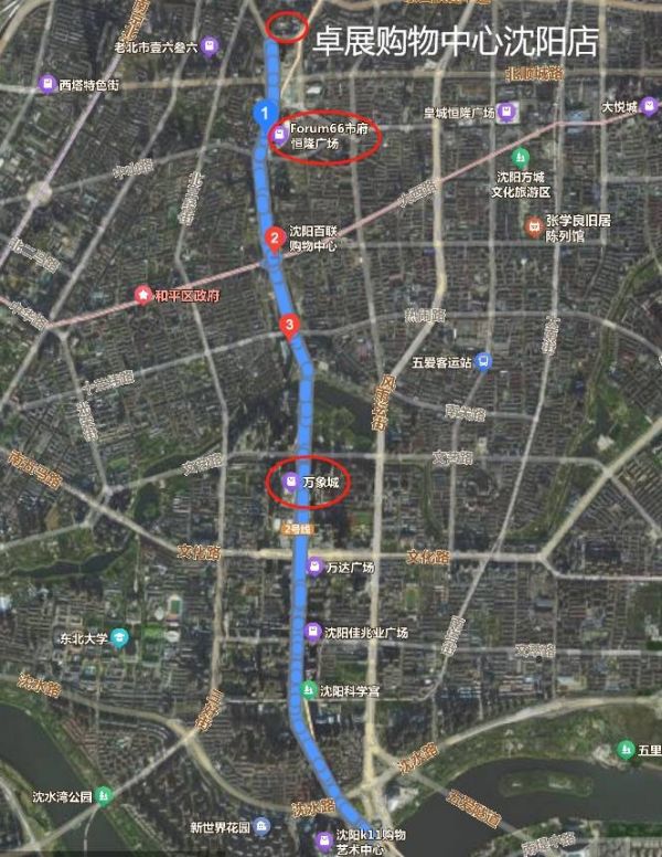 三个项目均位于沈阳地理、政治、经济、文化中轴线青年大街上。卓展、市府恒隆广场同属较老的市府商圈,两者距离不过700米。而万象城位于约2.7公里外新兴的金廊CBD,近年来沈阳往此处投入较多的城建资源。