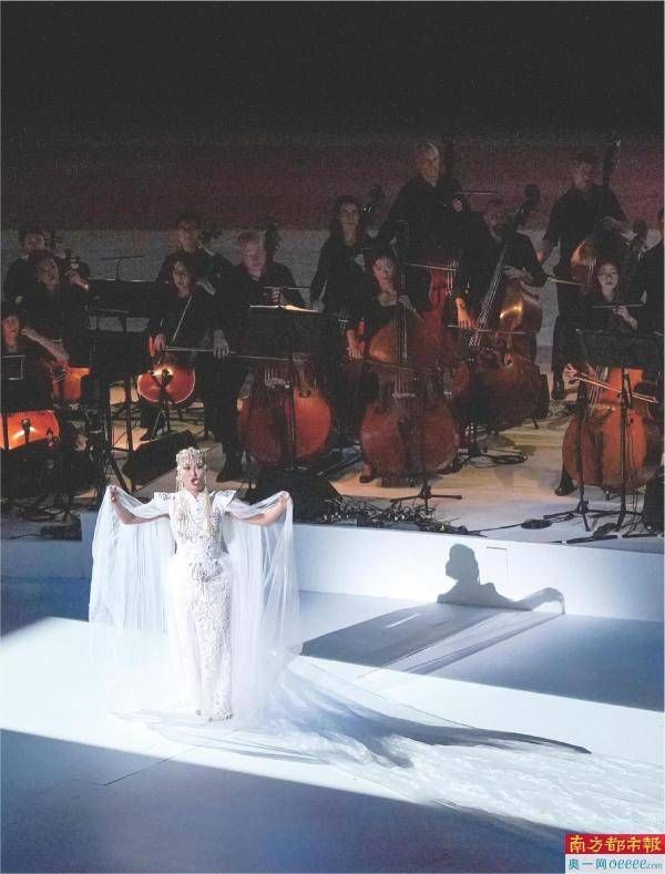 昨晚,第四届粤港澳大湾区文化艺术节开幕式在香港体育馆举行。大湾区乐团在著名作曲家谭盾指挥下,联袂带来交响诗《声音河流》的世界首演,内蒙古女歌唱家乌云塔娜在表演“呼麦”。 南方日报记者 仇敏业 摄
