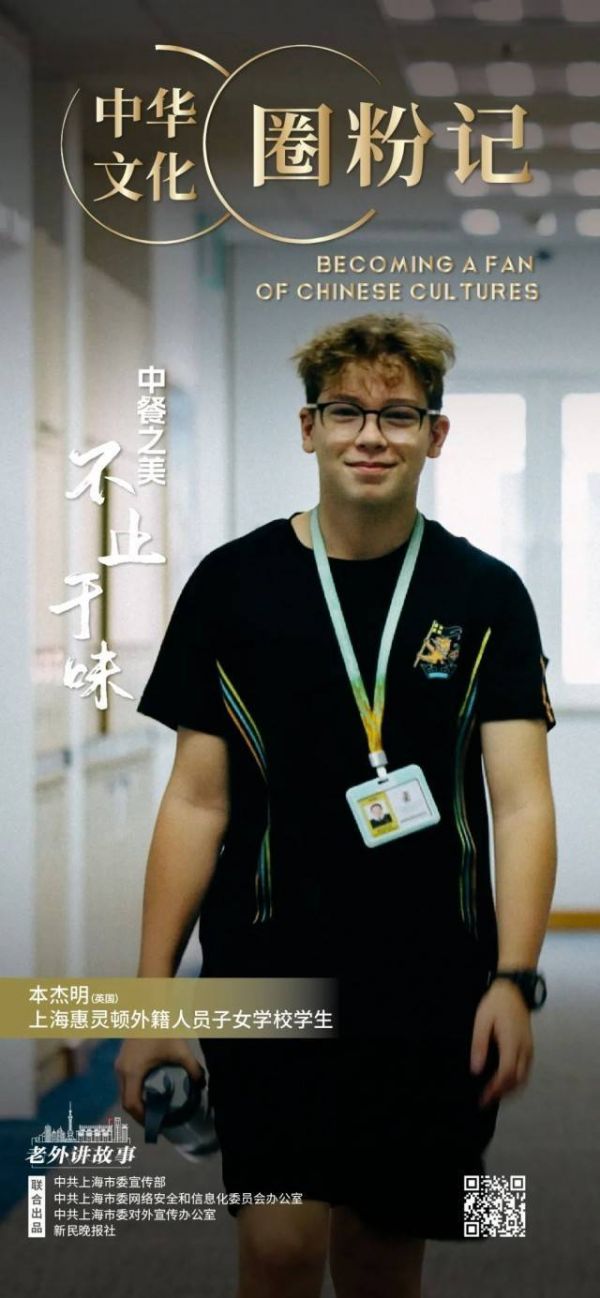一头卷发、戴着眼镜的本杰明是个热情、开朗的男孩,在上海惠灵顿外籍人员子女学校读8年级。他的爸爸大卫来自英国,是一名厨师。妈妈惠娜是匈牙利人,在惠灵顿学校担任音乐老师。姐姐艾玛15岁了,和本杰明读同一所学校。5年前,他们一家四口搬到上海生活。