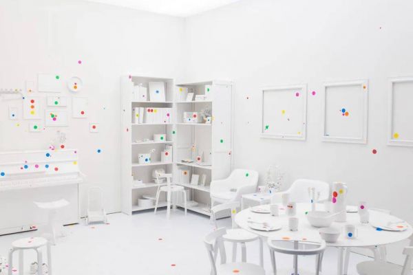 △草间弥生互动式作品《自我消融之屋》,参观者可以在此空间中任意贴上圆点贴纸,空间中的家具摆设按照参展地区而个别设计。(图/Wikipedia)